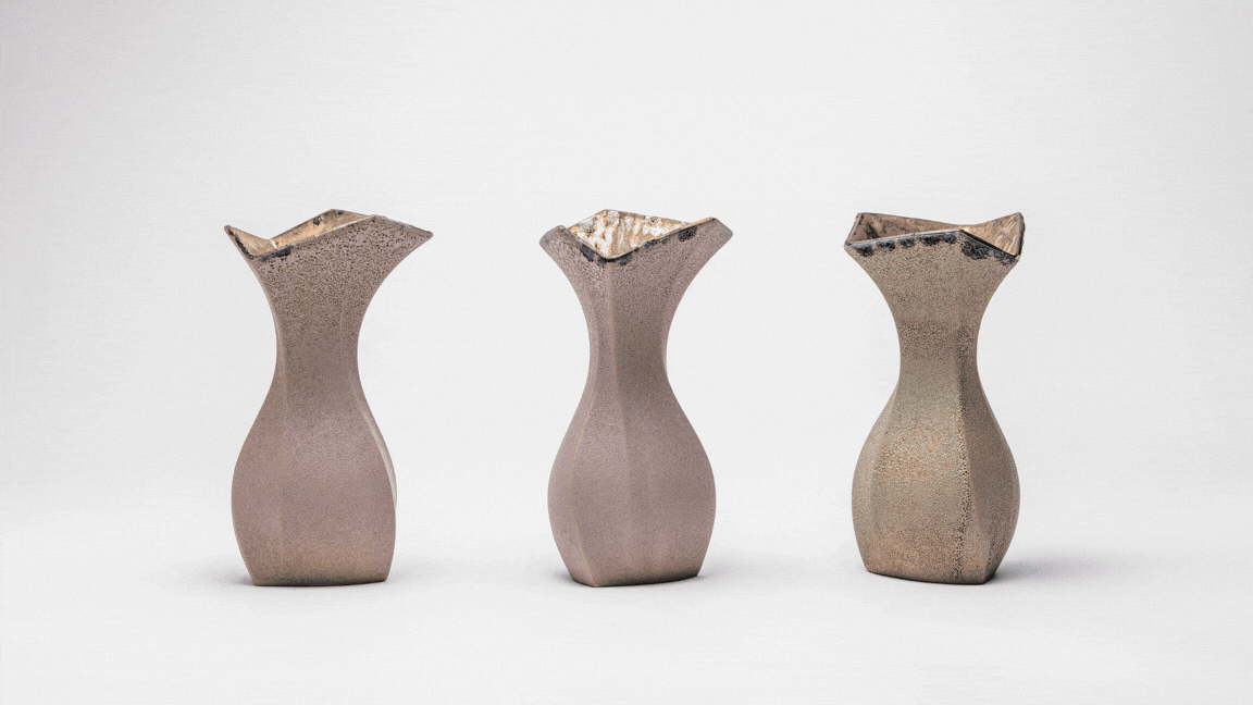 漆芸の「変り塗」に着想を得て、温度によって色が変化する塗料を磁器に幾層も塗り重ねて削り出しています。それにより、焼き物の釉薬特有の素材感と、奥行きのある表情が重なり合います。